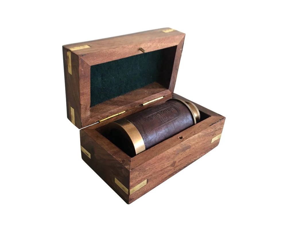 Brass, Glass, Leather, recycled and treated mango wood.